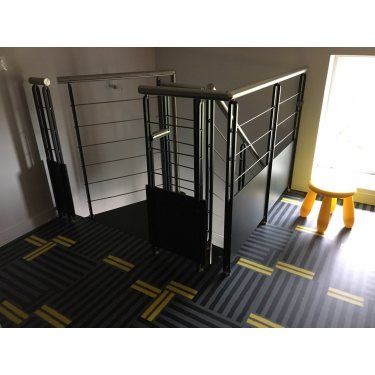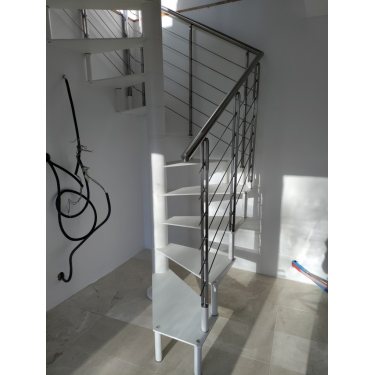 Escalier en colimaçon au design carré destiné à être placé en intérieur, il comporte une structure acier, des marches extra fines en acier plein, une main courante en inox.