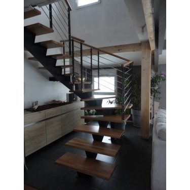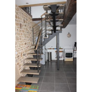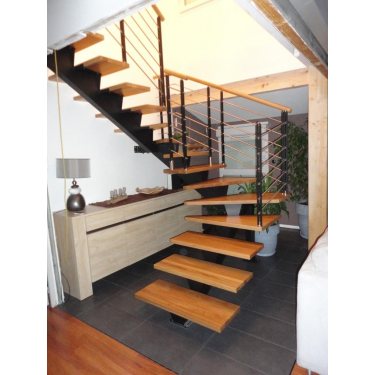 Ses marches en hêtre massif (40 mm d'épaisseur) son limon central (mono-poutre) en métal lui donnent de la légèreté et lui confèrent une ligne moderne (mais pas trop). Ses multiples choix de couleurs tant pour les marches que pour les parties métalliques feront de lui un véritable élément assorti à votre intérieur.